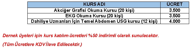 Dahiliyeciler İçin Akciğer Grafisi Okuma Kursu ve Dahiliyeciler İçin EKG Kursu; toplantı bilimsel programı ile eş zamanlı gerçekleşecek olup, ilk gün öğleden sonra ve ikinci gün ise öğleden önce gerçekleşecektir.